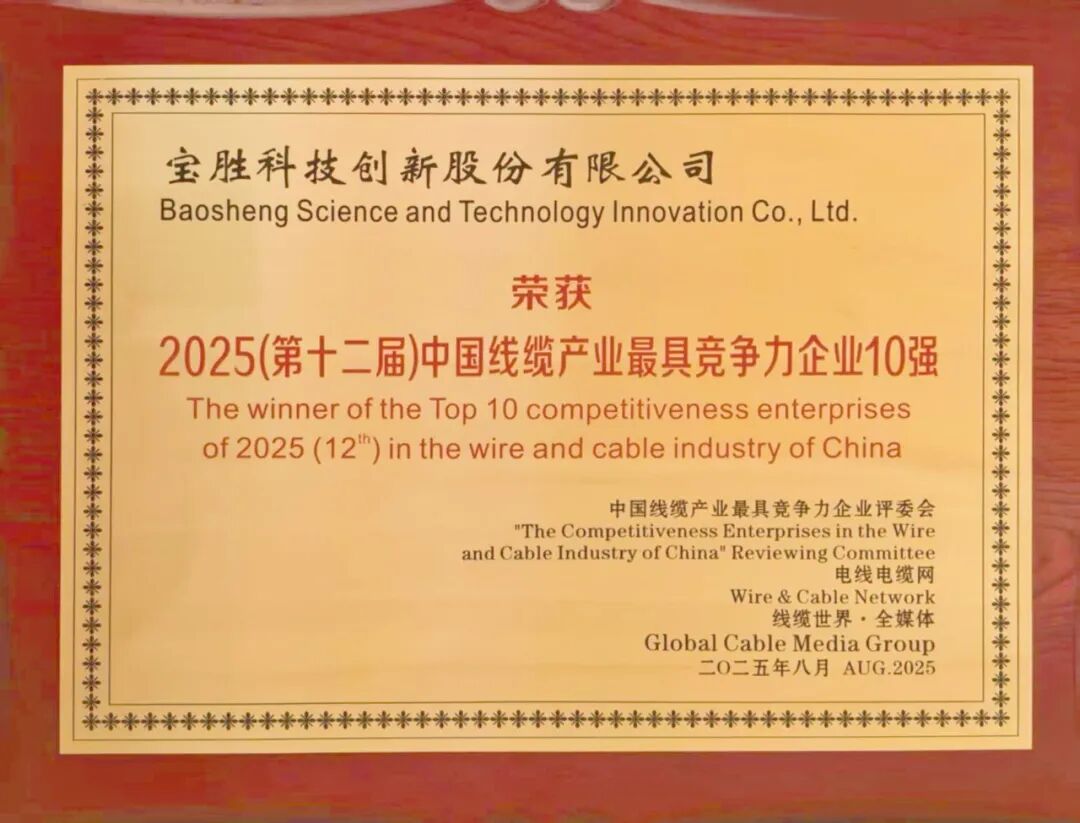 2025年8月26日,由中国电器工业协会电线电缆分会和上海电缆研究所有限公司联合举办的“2025中国电线电缆行业大会”系列活动在上海拉开序幕。活动现场重磅发布 2025年度中国线缆产业最具竞争力企业评测结果及工作报告,宝胜股份凭借强劲实力,连续12年荣登“中国线缆产业最具竞争力企业10强”榜单。