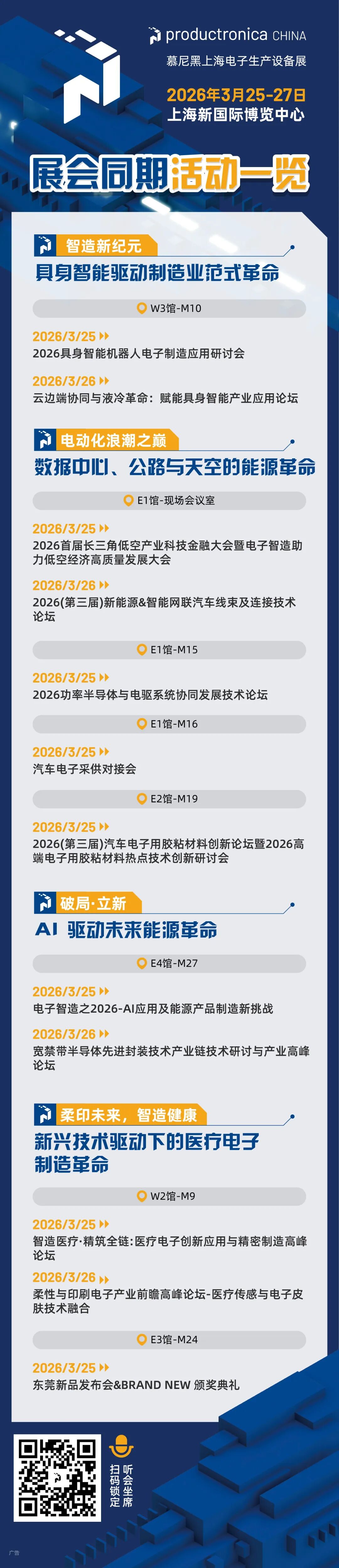 在四大主题框架下,论坛内容将进一步延伸至多个热点领域,包括具身智能机器人、低空经济、AI、算力、液冷技术、新能源汽车线束、功率半导体、汽车电子、点胶与胶粘剂、智能制造、先进封装、医疗电子、柔性印刷等方向,促进多维度交流与思想碰撞,共探电子制造发展新路径。