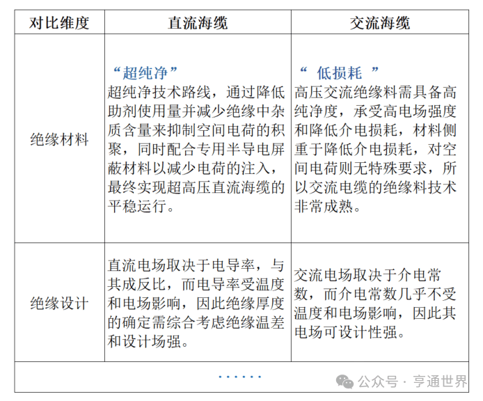要搞定这个“定时炸弹”,得从海缆的核心工序上动大手术。直流海缆的结构,特别是绝缘,与交流海缆相比发生了根本性的改变。我们从两个维度对比来看一下区别: