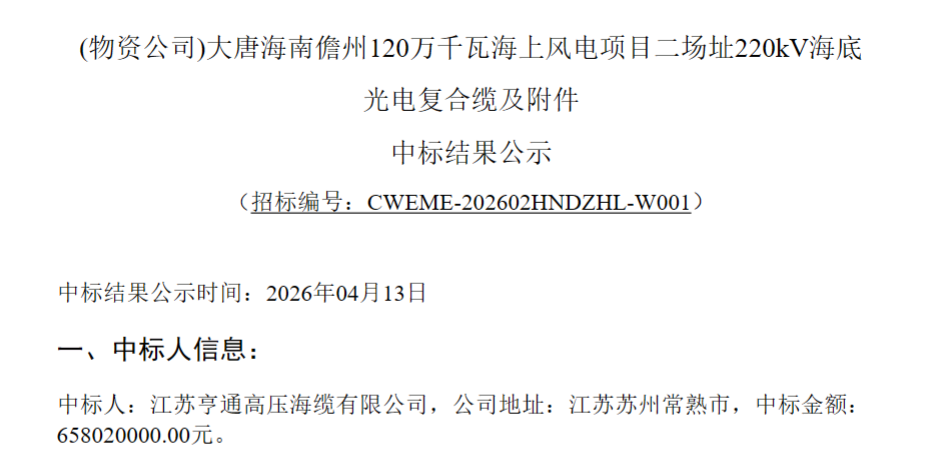 此前,亨通高压已中标大唐海南儋州120万千瓦海上风电项目二场址66kV海底光电复合缆及附件项目,中标金额267466700.00元。