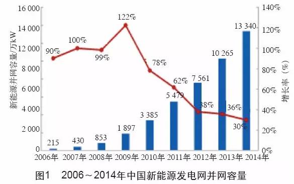 截至2014年底,全国新能源发电装机容量约13340万kW,同比增长28%,占全部发电装机容量的9.7%。风电、光伏发电合计并网装机容量突破1亿kW,占全国新能源装机的比例达到93%。